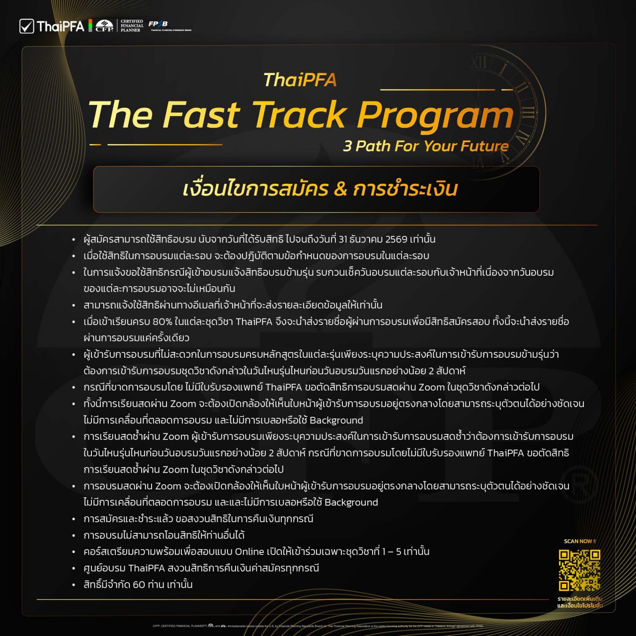 - เมื่อเข้าเรียนครบ 80% ในแต่ละชุดวิชา ThaiPFA จึงจะนำส่งรายชื่อผู้ผ่านการอบรมเพื่อมีสิทธิสมัครสอบ ทั้งนี้จะนำส่งรายชื่อผ่านการอบรมแค่ครั้งเดียว